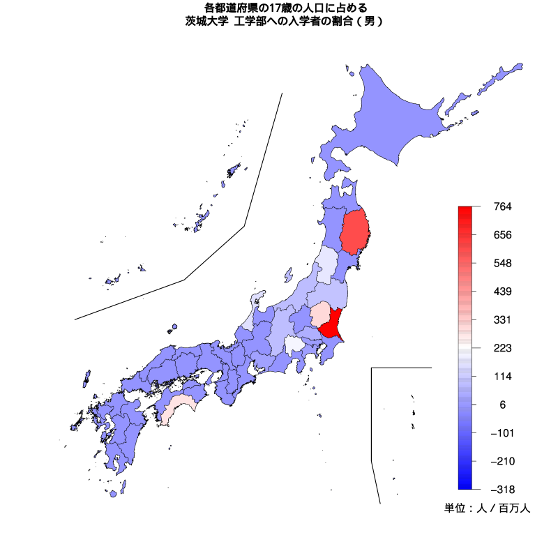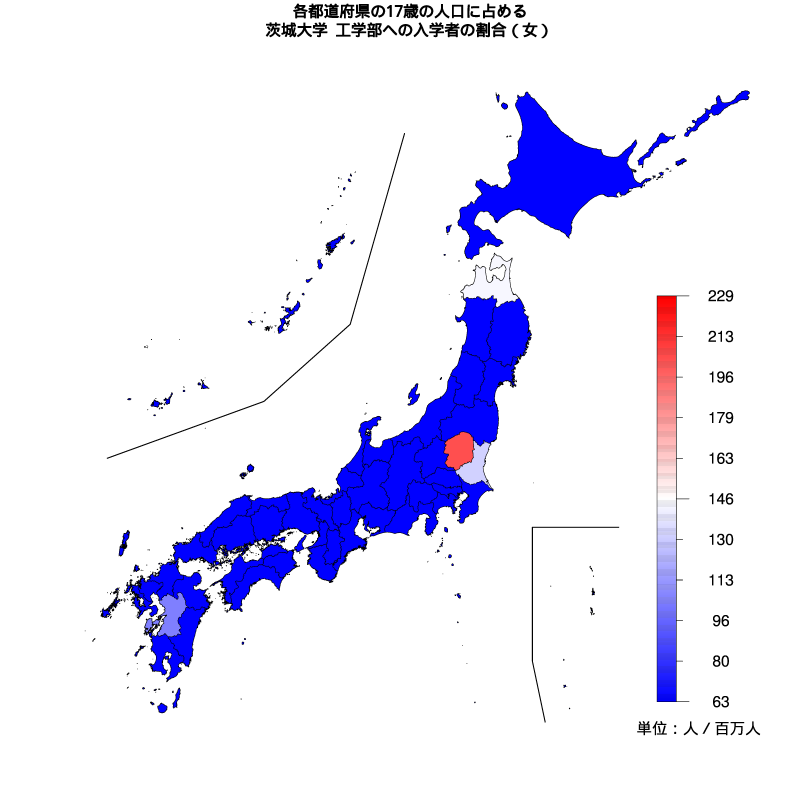 入学者の出身高校の所在都道府県とその数がデータ中に記載されています。下の地図では、国勢調査に記載されている各都道府県の17歳の人口を母数とし、で各都道府県からの入学者数を分子とした比をカラーマップで表示しています。
